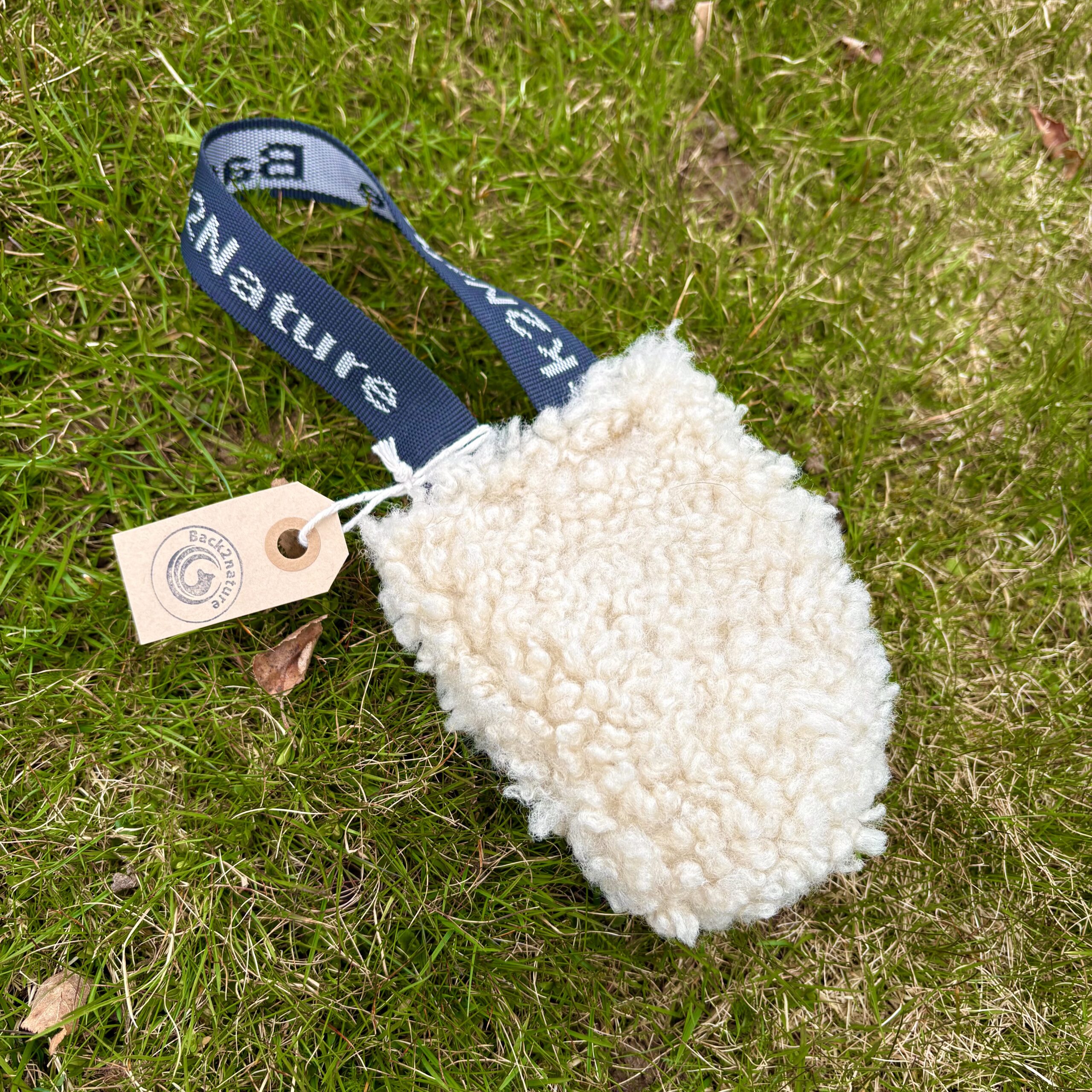 Äkta fårskinn med insydd pip. Vävt band med logga.